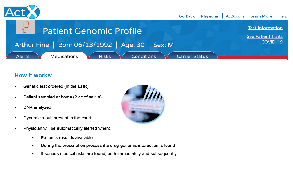 ActX Genomic Decision Support in NextGen EHR includes everything necessary to make genomics a routine part of health care. In addition to genomic decision support, our service offers affordable patient DNA testing based on 1 cc of saliva that can be ordered within the NextGen EHR . Visit our Physician Page to learn more about the testing process.